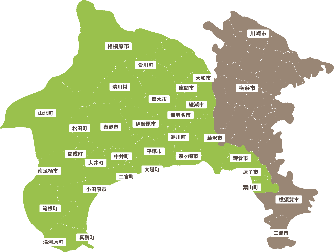 相模原市、平塚市、鎌倉市、藤沢市、小田原市、茅ヶ崎市、逗子市、秦野市、厚木市、大和市、伊勢原市、海老名市、座間市、南足柄市、綾瀬市、熱海市、葉山町、寒川町、大磯町、二宮町、中井町、大井町、松田町、山北町、開成町、箱根町、真鶴町、湯河原町、愛川町、清川村、他市立・私立保育園、病院、福祉施設、老人ホーム